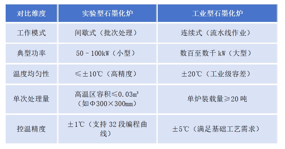 實(shí)驗(yàn)型與工業(yè)型石墨化爐在應(yīng)用場(chǎng)景、設(shè)計(jì)參數(shù)及工藝控制等方面存在顯著差異,主要區(qū)別總結(jié)如下: